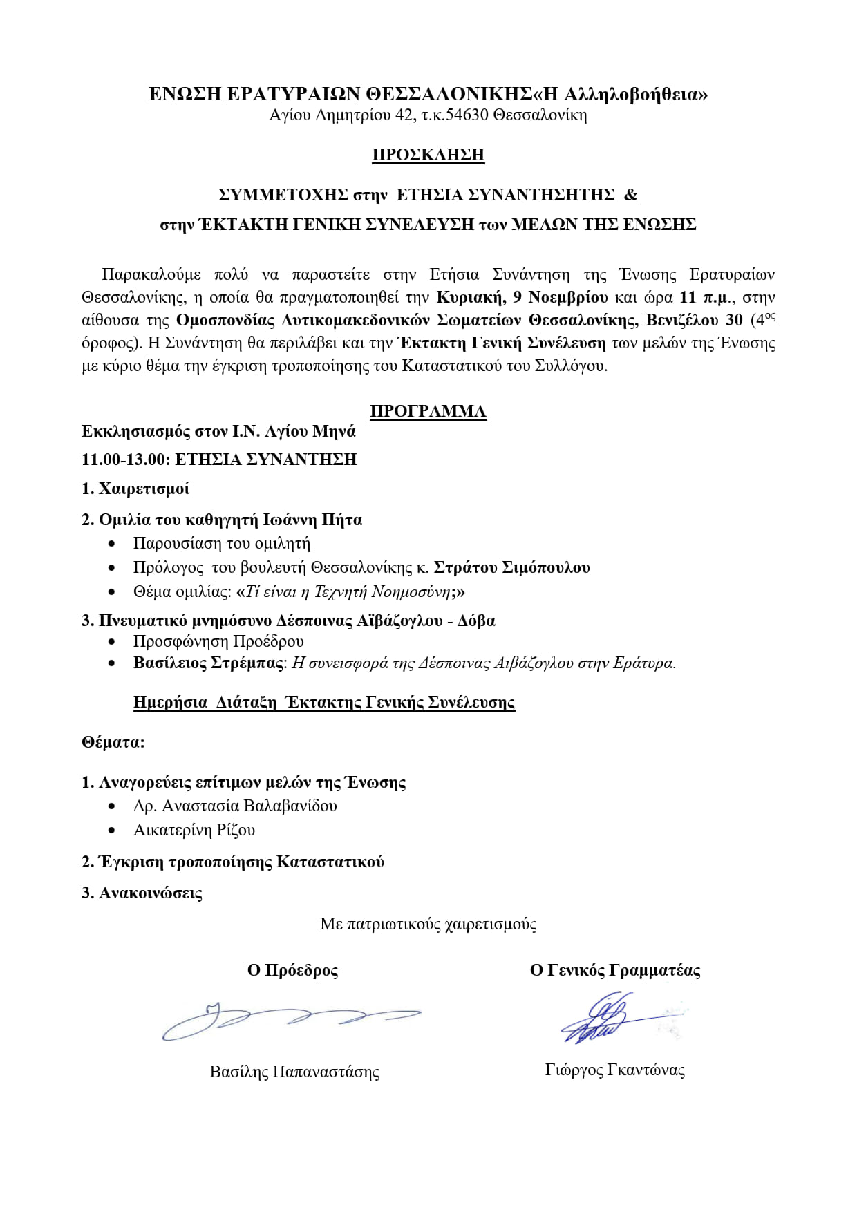 ΠΡΟΓΡΑΜΜΑ ΣΥΝΑΝΤΗΣΗΣ ΕΡΑΤΥΡΑΙΩΝ